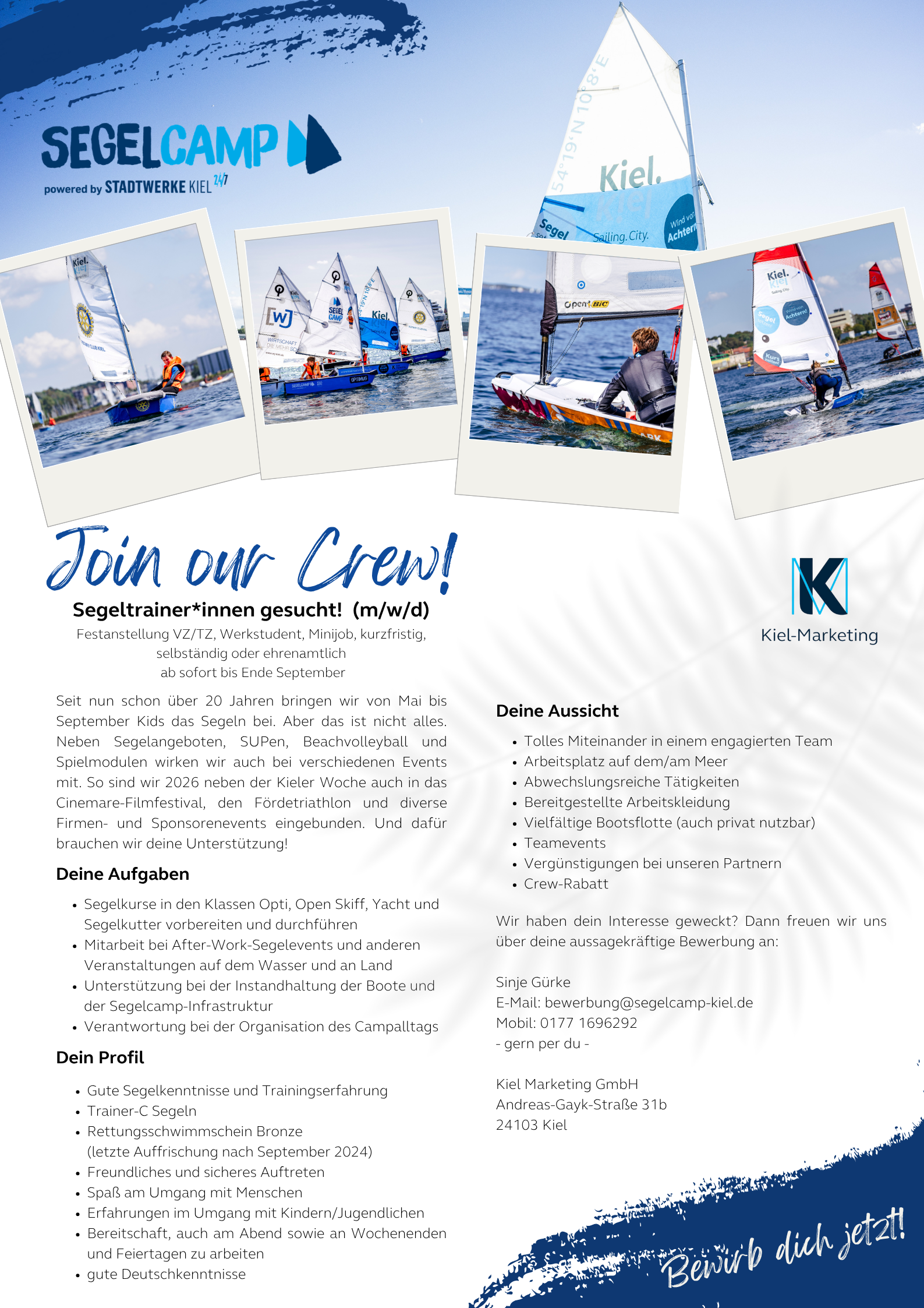 Kiel-Marketing entwickelt unter der Marke Kiel.Sailing.City die Kommunikation für die Tourismusdestination Kieler Förde, das Stadt- und Citymanagement der Landeshauptstadt Kiel sowie für die Kernpositionierung im Segelbereich. Kiel-Marketing ist als Verein und als GmbH organisiert. Rund 400 Unternehmen, Institutionen, Bürgerinnen und Bürger sowie die Landeshauptstadt in der GmbH als Gesellschafterin, bringen ihr Engagement, mit dem gemeinsamen Ziel den Standort Kiel zu stärken, in die beiden Gesellschaften ein. Hierzu werden Kräfte und Mittel gebündelt. Unter www.kiel-sailing-city.de erfahren sie mehr.